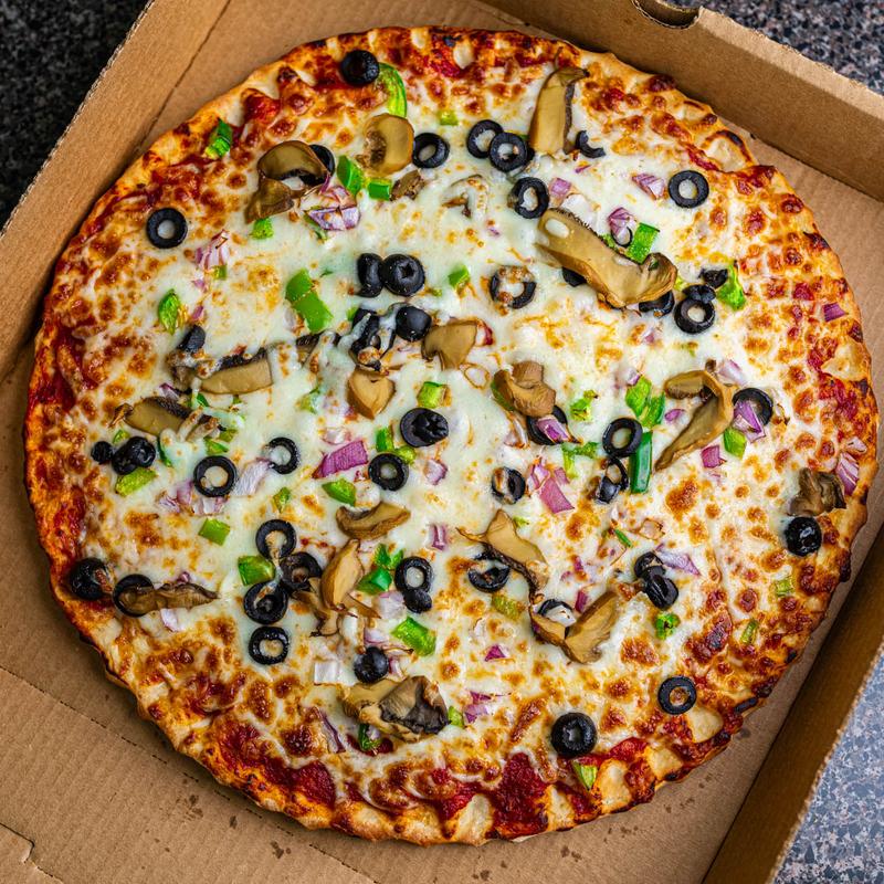 Medium $14.99 | Large $19.99 • Pizza sauce, diced red onion, green peppers, black olives, mushrooms, shredded mozzarella cheese.