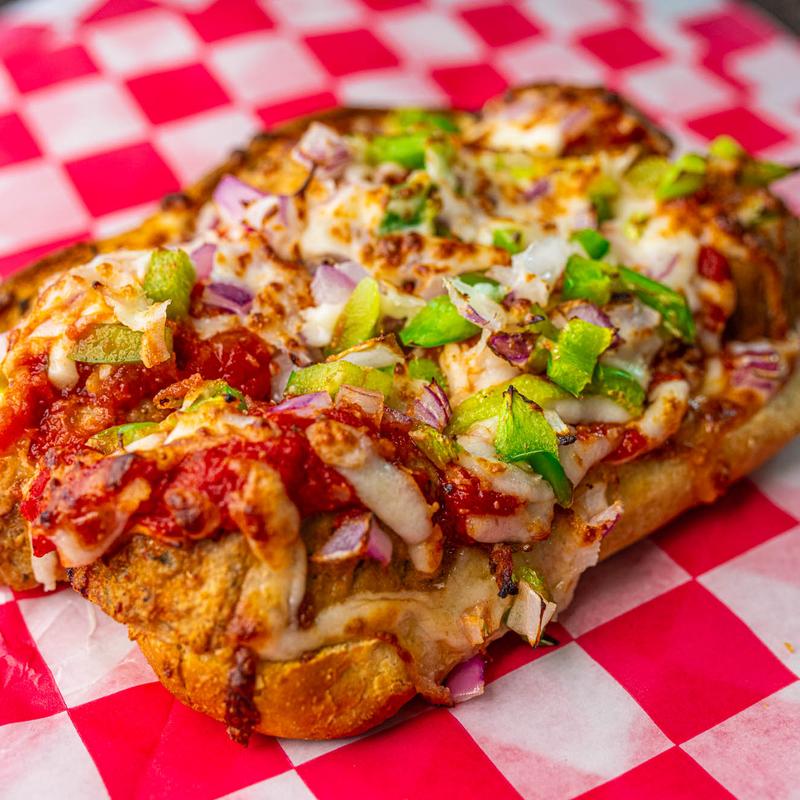 Philly steak, topped with green pepper and red onion, sliced provolone and shredded mozzarella cheese, on a brat bun. Served with 3oz French fries.